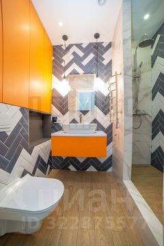 - Современный санузел с тёплыми полами, большим шкафом, электрическим полотенцесушителем и просторной душевой кабиной.