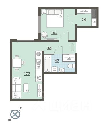 Жилая площадь 10.7 м2, кухня 17.7 м2, чистовая отделка. Раздельных санузлов - нет, балконов - нет, лоджий - нет.