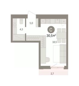 Продается 1-комн. студия от застройщика с предчистовой отделкой в ЖК "Квартал Траектория" на 4 этаже. Общая площадь: 30.5 кв.м., площадь гостиной 18.5 кв.м., из которых 5 кв.м. выделено под кухонную зону. Все окна выходят на одну сторону. В квартире один балкон, один совмещенный санузел. Высота потолков 2.82 м.
