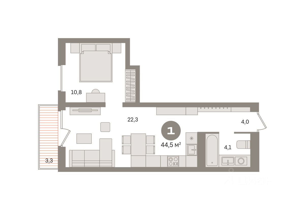 Квартира с кухней-гостиной и одной спальней в Северном квартале. Особенности планировки: вид во двор, предчистовая отделка, балкон.