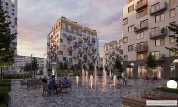 Оживлённое уличное движение останется за пределами квартала, а внутри создается собственная природная среда с зонами для вечерних прогулок, расслабленного отдыха, спорта и игр. Между домов проходит широкий пешеходный бульвар с разнообразным ландшафтом. Он объединяет общественные пространства между кварталами и переходит в площадь-сквер с фонтаном.