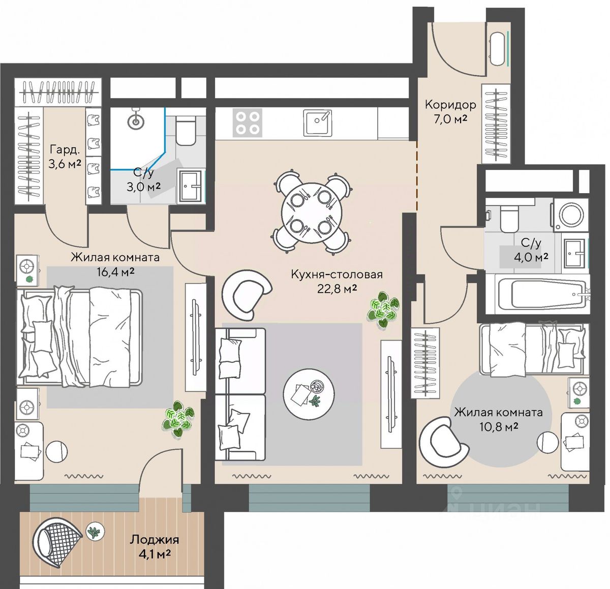 Продаётся 2-комнатная квартира в строящемся доме (Дом 1 этап 1.1), срок сдачи: I-кв. 2028, общей площадью 69.7 кв.м., на 20 этаже.