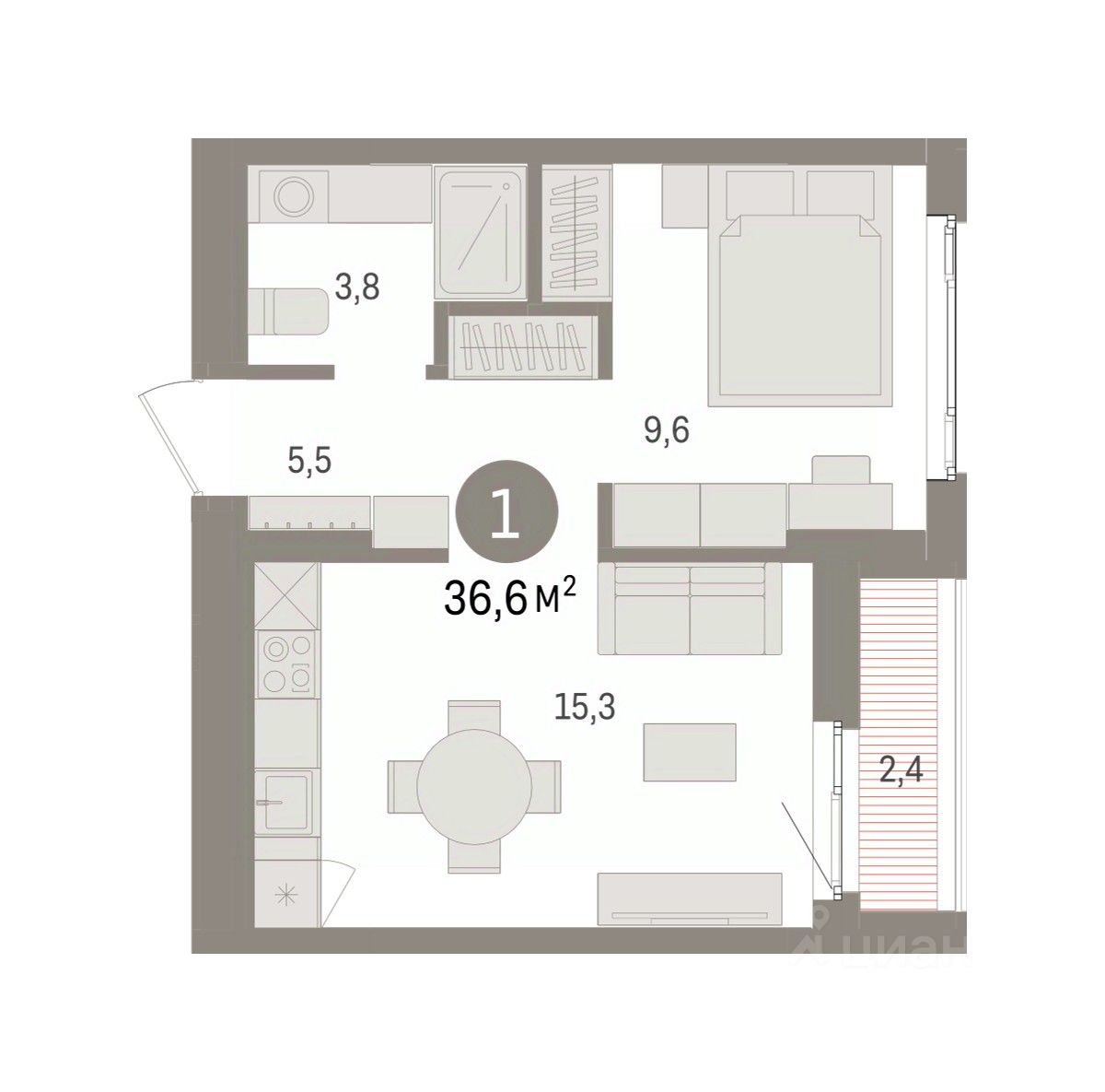 1-комн. квартира от застройщика с предчистовой отделкой в ЖК "Квартал Траектория" на 2 этаже. Общая площадь: 36.6 кв.м., жилая: 9.6 кв.м., площадь просторной кухни-столовой: 15.3 кв.м. Все окна выходят на одну сторону. В квартире одна лоджия, один совмещенный санузел. Высота потолков 2.82 м.