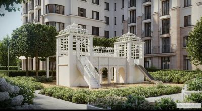 Вход во двор организован через колоннаду. Планировочно он разделён на две части. Парадный партер с большим количеством стриженых растений, фонтанами, цветущими кустарниками и более "домашняя", уютная зона, где высажены деревья и низкорослые хвойные растения, многолетники. В центре двора — две детские площадки. #2m6W07