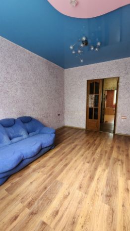 В комнатах на полу ламинат, двухуровневые натяжные потолки, стены выровнены.