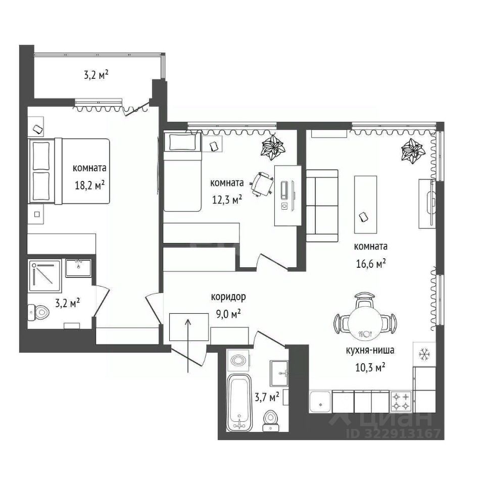 Просторная кухня-гостиная, две изолированные спальни и два санузла.
