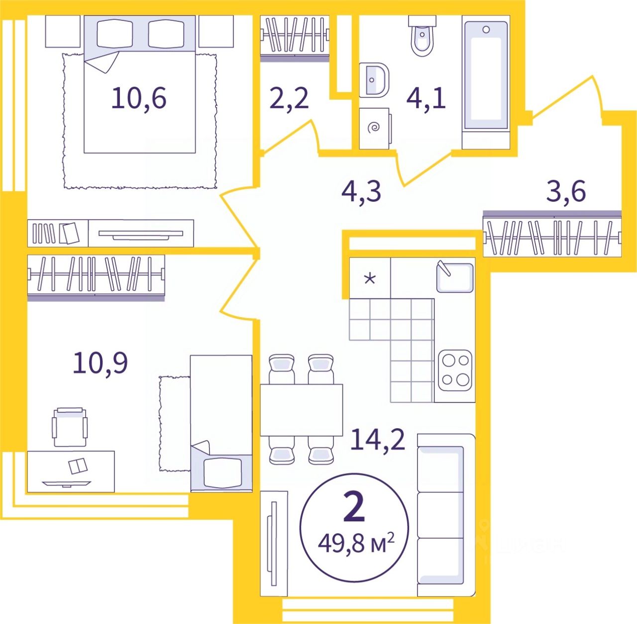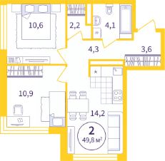 Двухкомнатная квартира с предчистовой отделкой в ЖК "Астон.Реформа" на 3 этаже. Общая площадь: 49.81 кв.м., жилая: 21.5 кв.м., площадь просторной кухни-столовой: 14.2 кв.м. Угловая квартира, идеально подойдет любителям тишины и панорамных видов. В квартире один совмещенный санузел. Высота потолков 2.7 м.