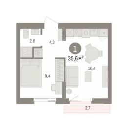 1-комн. квартира с предчистовой отделкой в ЖК "Квартал Траектория" на 4 этаже. Общая площадь: 35.6 кв.м. Высота потолков 2.82 м.