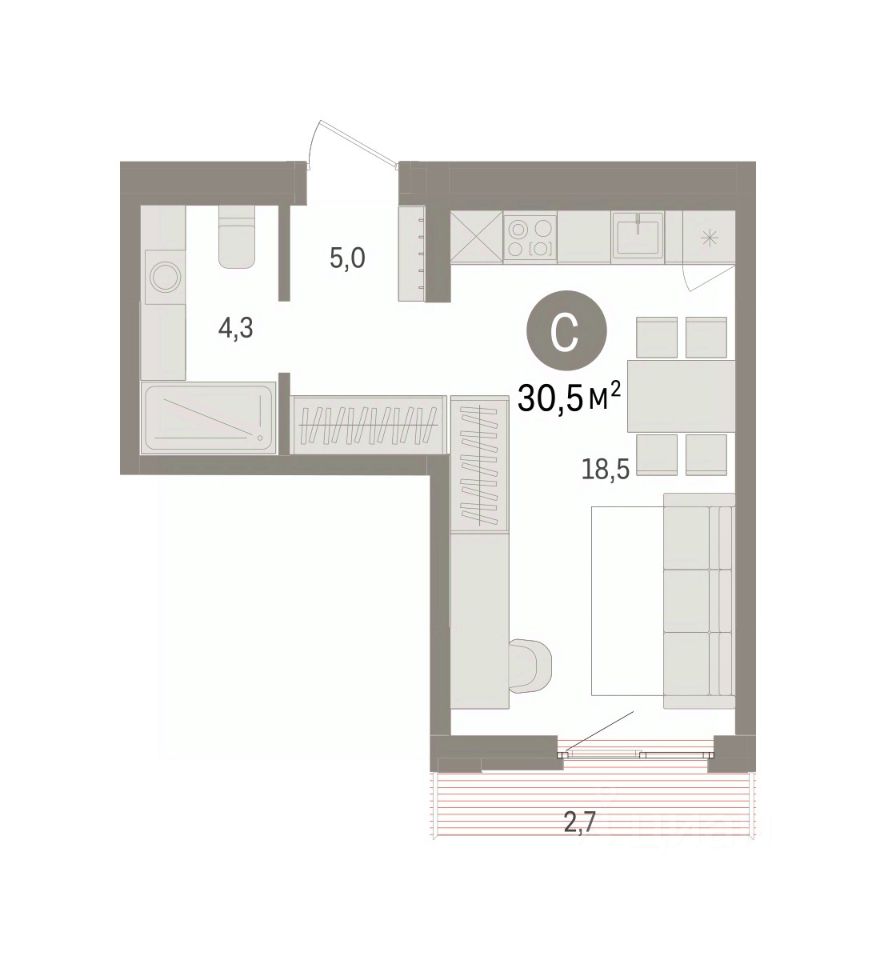 Однокомнатная студия с предчистовой отделкой в ЖК "Квартал Траектория" на 3 этаже. Общая площадь: 30.5 кв.м., площадь гостиной 18.5 кв.м., из которых 5 кв.м. выделено под кухонную зону. Все окна выходят на одну сторону. В квартире один балкон, один совмещенный санузел. Высота потолков 2.82 м.