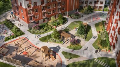 Территория комплекса огорожена от машин и посторонних людей. Озеленение с многолетними растениями и деревьями создает ощущение близости к природе. Двор наполнен всем необходимым: песочницы и качели для самых маленьких, интерактивная башня для детей постарше, воркаут-зона и места для отдыха. На всей территории реализована безбарьерная среда.