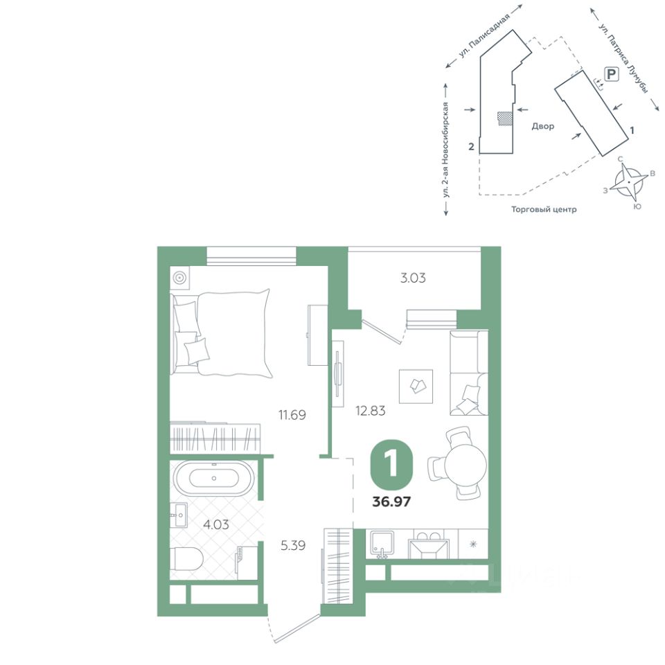 Квартира находится в ЖК "Бодровский" от федерального застройщика "Паритет Девелопмент". Это жилой комплекс комфорт-класса с современной архитектурой, расположенный в Екатеринбурге в районе улиц Патриса Лумумбы и 2-й Новосибирской.