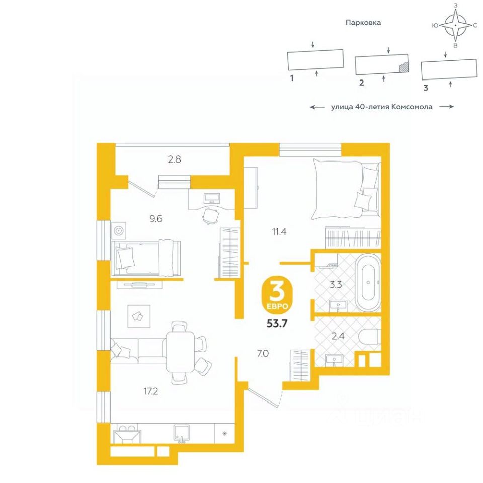 Евроформат объединяет кухню и гостиную в одно просторное помещение, что создает ощущение свободы и открытости пространства. Такая планировка предлагает гибкость в оформлении интерьера, позволяя обустроить зону в соответствии с личными предпочтениями, будь то уютный уголок для чтения или стильная обеденная зона. Идеально для тех, кто стремится к гармонии практичности и эстетики в своем доме. Квартира располагается в ЖК "Комсомольский" — жилом комплексе комфорт-класса. Здесь вы будете наслаждаться беззаботной жизнью, ведь ваш дом — воплощение практичности, безопасности и надежности. Для удобства предусмотрены колясочные на первых этажах домов, где можно оставить велосипеды и коляски в тепле. За безопасность отвечают система электронных ключей и видеонаблюдение. Еще здесь собственная котельная, поэтому в доме всегда будут горячая вода и оплата счетов только за фактически потребленное тепло. ПРЕИМУЩЕСТВА ЖК На этаже 15 квартир Красивые и функциональные парадные с мягкой и стильной зоной для отдыха, книгообменником, встроенными почтовыми ящиками и нишами для сумок Колясочные с доступом по ключу IP-домофоны Тихие лифты с плавным ходом О ПРОЕКТЕ ЖК "Комсомольский" строится в спокойном Кировском районе Екатеринбурга в границах улиц Сыромолотова — Рассветная — 40-лет Комсомола. Комплекс состоит из трех домов переменной этажности, которые выделяются динамичными линиями, выразительными фасадами и стильными лоджиями. ЛОКАЦИЯ Всё, что необходимо для повседневной жизни, находится недалеко от дома: школы, детские сады, продуктовые магазины, фитнес-клубы. Дорога до центра города на машине займет всего 10 минут — достаточно повернуть с улицы 40-летия Комсомола на улицу Владимира Высоцкого. Рядом с этим перекрестком начинается "Тропа здоровья" — большой терренкур вдоль "Каменных палаток". 10 мин до центра 3-4 минуты до школы No 82, гимназии No 176 4-5 минут до детских садов No 208, No 583, 266 20 мин до Свердловского областного медицинского колледжа и Центральной городской больницы No 7 В рамках стратегического развития района на первых этажах домов появятся коммерческие помещения, в которых откроются магазины и кафе. Следует учесть, что к 2030 году в Кировском районе планируется формирование регионального рекреационно-оздоровительного кластера, строительство ветки метро, расширение и модернизация старых промышленных зон социальной и бизнес-инфраструктуры, что приведет к созданию комфортной среды для жизни. Кроме того, в стратегию входит развитие Шарташского лесного парка как центра регионального и международного туризма. СПОСОБЫ ПОКУПКИ Ипотека: подберем выгодные условия в нескольких банках, чтобы вы могли выбрать лучшее Материнской капитал: можно использовать в качестве первоначального взноса Рассрочка: платите частями без % Сертификаты: позволяют оплатить часть стоимости квартиры О КОМПАНИИ "Паритет Девелопмент" — это современный и ответственный подход к реализации проектов в сфере жилищного строительства. Компания формирует сре