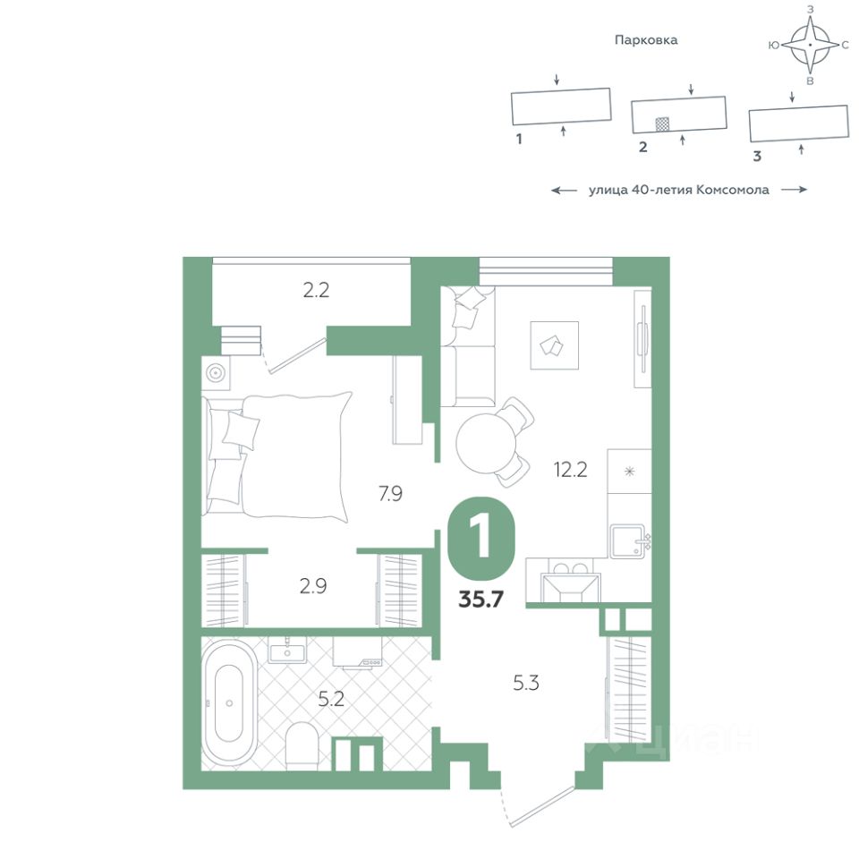 Эта квартира — образец функционала и практичности: встроенные ниши под шкафы эргономично организуют хранение, а высокие потолки подчеркивают ощущение простора. Здесь царит продуманный баланс — рациональная планировка и прозрачная логика пространства готовы служить вашим потребностям и создавать приятную среду для жизни. Квартира располагается в ЖК "Комсомольский" — жилом комплексе комфорт-класса. Здесь вы будете наслаждаться беззаботной жизнью, ведь ваш дом — воплощение практичности, безопасности и надежности. Для удобства предусмотрены колясочные на первых этажах домов, где можно оставить велосипеды и коляски в тепле. За безопасность отвечают система электронных ключей и видеонаблюдение. Еще здесь собственная котельная, поэтому в доме всегда будут горячая вода и оплата счетов только за фактически потребленное тепло. ПРЕИМУЩЕСТВА ЖК На этаже 15 квартир Красивые и функциональные парадные с мягкой и стильной зоной для отдыха, книгообменником, встроенными почтовыми ящиками и нишами для сумок Колясочные с доступом по ключу IP-домофоны Тихие лифты с плавным ходом О ПРОЕКТЕ ЖК "Комсомольский" строится в спокойном Кировском районе Екатеринбурга в границах улиц Сыромолотова — Рассветная — 40-лет Комсомола. Комплекс состоит из трех домов переменной этажности, которые выделяются динамичными линиями, выразительными фасадами и стильными лоджиями. ЛОКАЦИЯ Всё, что необходимо для повседневной жизни, находится недалеко от дома: школы, детские сады, продуктовые магазины, фитнес-клубы. Дорога до центра города на машине займет всего 10 минут — достаточно повернуть с улицы 40-летия Комсомола на улицу Владимира Высоцкого. Рядом с этим перекрестком начинается "Тропа здоровья" — большой терренкур вдоль "Каменных палаток". 10 мин до центра 3-4 минуты до школы No 82, гимназии No 176 4-5 минут до детских садов No 208, No 583, 266 20 мин до Свердловского областного медицинского колледжа и Центральной городской больницы No 7 В рамках стратегического развития района на первых этажах домов появятся коммерческие помещения, в которых откроются магазины и кафе. Следует учесть, что к 2030 году в Кировском районе планируется формирование регионального рекреационно-оздоровительного кластера, строительство ветки метро, расширение и модернизация старых промышленных зон социальной и бизнес-инфраструктуры, что приведет к созданию комфортной среды для жизни. Кроме того, в стратегию входит развитие Шарташского лесного парка как центра регионального и международного туризма. СПОСОБЫ ПОКУПКИ Ипотека: подберем выгодные условия в нескольких банках, чтобы вы могли выбрать лучшее Материнской капитал: можно использовать в качестве первоначального взноса Рассрочка: платите частями без % Сертификаты: позволяют оплатить часть стоимости квартиры О КОМПАНИИ "Паритет Девелопмент" — это современный и ответственный подход к реализации проектов в сфере жилищного строительства. Компания формирует среду, способную создать новое качество жизни для клиентов, поэтому каждый