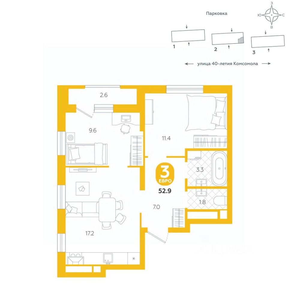 Евроформат объединяет кухню и гостиную в одно просторное помещение, что создает ощущение свободы и открытости пространства. Такая планировка предлагает гибкость в оформлении интерьера, позволяя обустроить зону в соответствии с личными предпочтениями, будь то уютный уголок для чтения или стильная обеденная зона. Идеально для тех, кто стремится к гармонии практичности и эстетики в своем доме. Квартира располагается в ЖК "Комсомольский" — жилом комплексе комфорт-класса. Здесь вы будете наслаждаться беззаботной жизнью, ведь ваш дом — воплощение практичности, безопасности и надежности. Для удобства предусмотрены колясочные на первых этажах домов, где можно оставить велосипеды и коляски в тепле. За безопасность отвечают система электронных ключей и видеонаблюдение. Еще здесь собственная котельная, поэтому в доме всегда будут горячая вода и оплата счетов только за фактически потребленное тепло. ПРЕИМУЩЕСТВА ЖК На этаже 15 квартир Красивые и функциональные парадные с мягкой и стильной зоной для отдыха, книгообменником, встроенными почтовыми ящиками и нишами для сумок Колясочные с доступом по ключу IP-домофоны Тихие лифты с плавным ходом О ПРОЕКТЕ ЖК "Комсомольский" строится в спокойном Кировском районе Екатеринбурга в границах улиц Сыромолотова — Рассветная — 40-лет Комсомола. Комплекс состоит из трех домов переменной этажности, которые выделяются динамичными линиями, выразительными фасадами и стильными лоджиями. ЛОКАЦИЯ Всё, что необходимо для повседневной жизни, находится недалеко от дома: школы, детские сады, продуктовые магазины, фитнес-клубы. Дорога до центра города на машине займет всего 10 минут — достаточно повернуть с улицы 40-летия Комсомола на улицу Владимира Высоцкого. Рядом с этим перекрестком начинается "Тропа здоровья" — большой терренкур вдоль "Каменных палаток". 10 мин до центра 3-4 минуты до школы No 82, гимназии No 176 4-5 минут до детских садов No 208, No 583, 266 20 мин до Свердловского областного медицинского колледжа и Центральной городской больницы No 7 В рамках стратегического развития района на первых этажах домов появятся коммерческие помещения, в которых откроются магазины и кафе. Следует учесть, что к 2030 году в Кировском районе планируется формирование регионального рекреационно-оздоровительного кластера, строительство ветки метро, расширение и модернизация старых промышленных зон социальной и бизнес-инфраструктуры, что приведет к созданию комфортной среды для жизни. Кроме того, в стратегию входит развитие Шарташского лесного парка как центра регионального и международного туризма. СПОСОБЫ ПОКУПКИ Ипотека: подберем выгодные условия в нескольких банках, чтобы вы могли выбрать лучшее Материнской капитал: можно использовать в качестве первоначального взноса Рассрочка: платите частями без % Сертификаты: позволяют оплатить часть стоимости квартиры О КОМПАНИИ "Паритет Девелопмент" — это современный и ответственный подход к реализации проектов в сфере жилищного строительства. Компания формирует сре