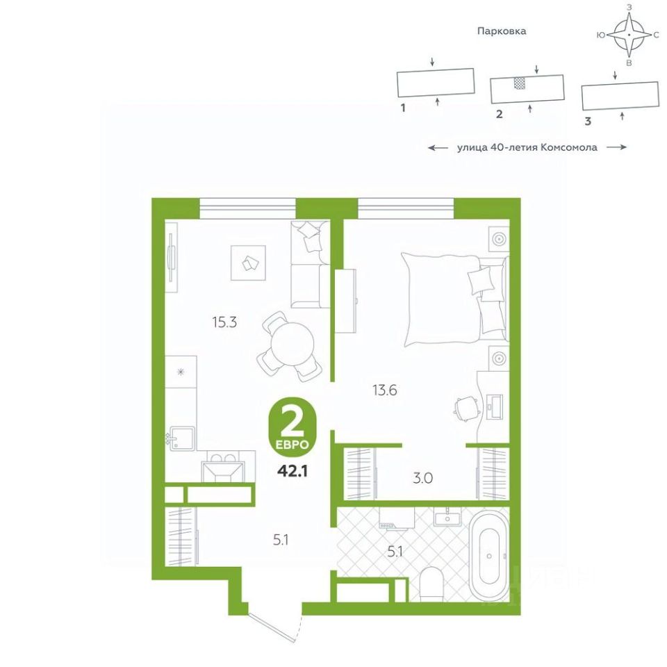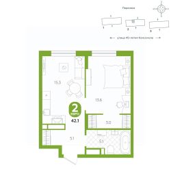 Квартира располагается в ЖК "Комсомольский" — жилом комплексе комфорт-класса. Здесь вы будете наслаждаться беззаботной жизнью, ведь ваш дом — воплощение практичности, безопасности и надежности. Для удобства предусмотрены колясочные на первых этажах домов, где можно оставить велосипеды и коляски в тепле. За безопасность отвечают система электронных ключей и видеонаблюдение. Еще здесь собственная котельная, поэтому в доме всегда будут горячая вода и оплата счетов только за фактически потребленное тепло.
