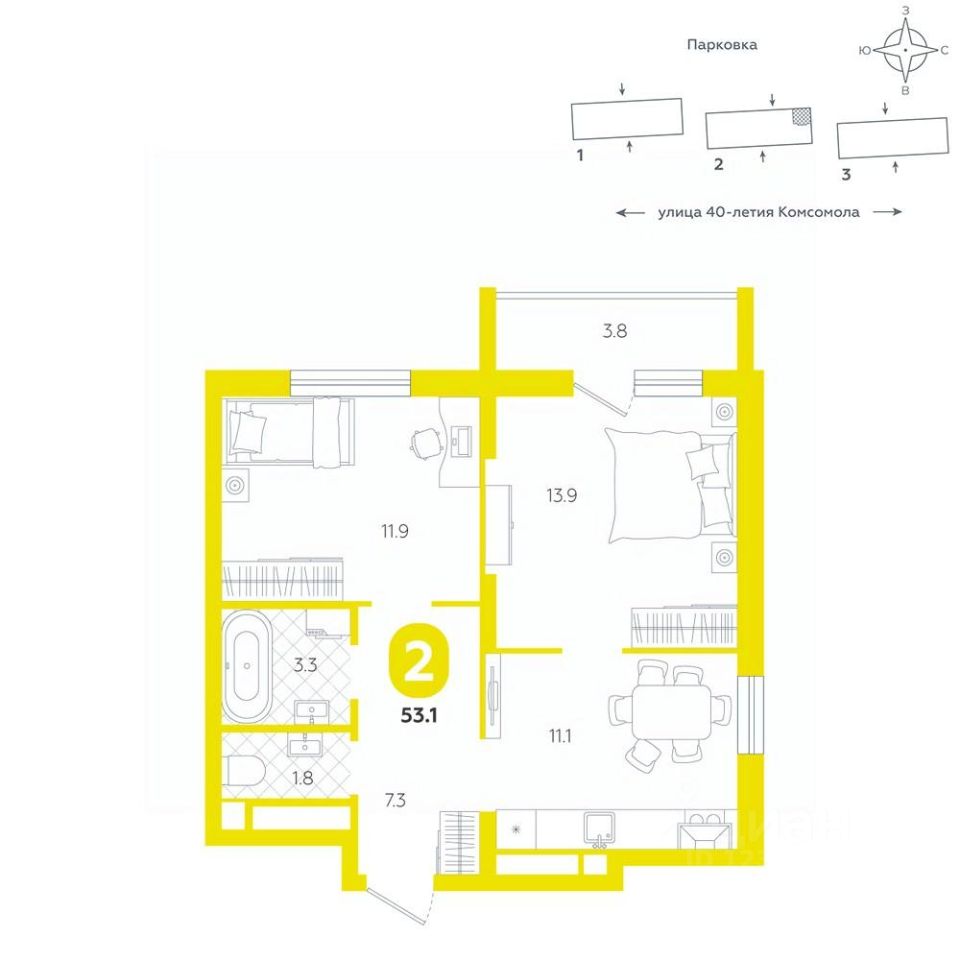 Квартира располагается в ЖК "Комсомольский" — жилом комплексе комфорт-класса. Здесь вы будете наслаждаться беззаботной жизнью, ведь ваш дом — воплощение практичности, безопасности и надежности. Для удобства предусмотрены колясочные на первых этажах домов, где можно оставить велосипеды и коляски в тепле. За безопасность отвечают система электронных ключей и видеонаблюдение. Еще здесь собственная котельная, поэтому в доме всегда будут горячая вода и оплата счетов только за фактически потребленное тепло.