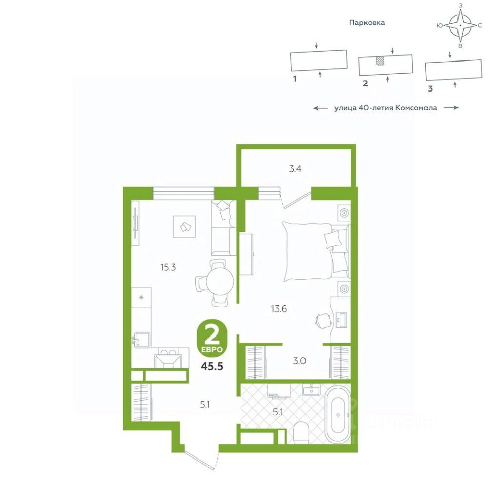Квартира располагается в ЖК "Комсомольский" — жилом комплексе комфорт-класса. Здесь вы будете наслаждаться беззаботной жизнью, ведь ваш дом — воплощение практичности, безопасности и надежности. Для удобства предусмотрены колясочные на первых этажах домов, где можно оставить велосипеды и коляски в тепле. За безопасность отвечают система электронных ключей и видеонаблюдение. Еще здесь собственная котельная, поэтому в доме всегда будут горячая вода и оплата счетов только за фактически потребленное тепло.