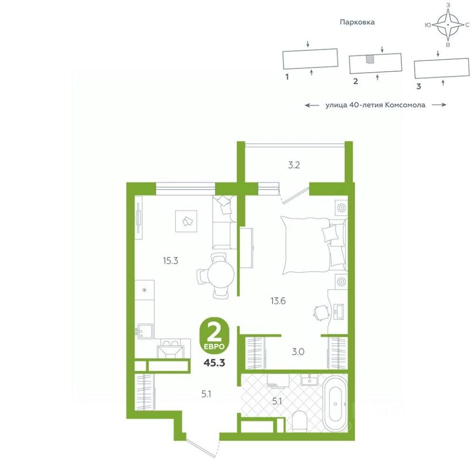 Квартира располагается в ЖК "Комсомольский" — жилом комплексе комфорт-класса. Здесь вы будете наслаждаться беззаботной жизнью, ведь ваш дом — воплощение практичности, безопасности и надежности. Для удобства предусмотрены колясочные на первых этажах домов, где можно оставить велосипеды и коляски в тепле. За безопасность отвечают система электронных ключей и видеонаблюдение. Еще здесь собственная котельная, поэтому в доме всегда будут горячая вода и оплата счетов только за фактически потребленное тепло.