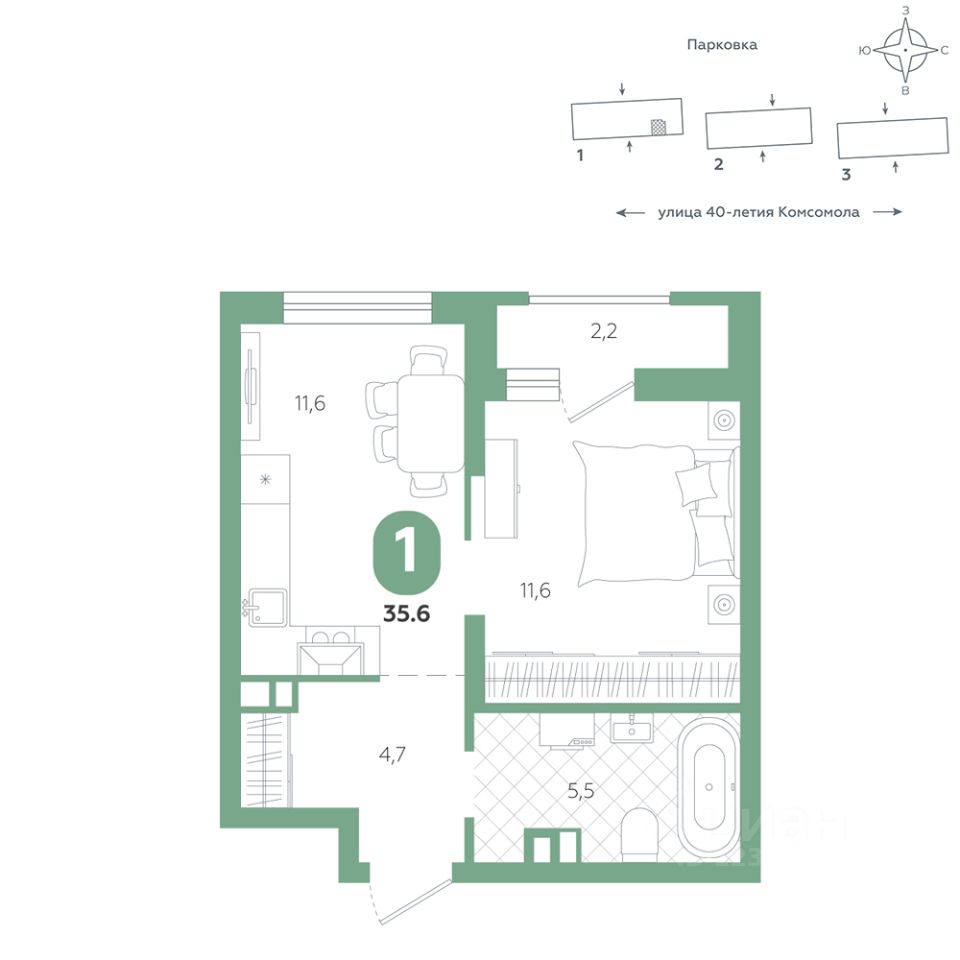 Эта квартира — образец функционала и практичности: встроенные ниши под шкафы эргономично организуют хранение, а высокие потолки подчеркивают ощущение простора. Здесь царит продуманный баланс — рациональная планировка и прозрачная логика пространства готовы служить вашим потребностям и создавать приятную среду для жизни. Квартира располагается в ЖК "Комсомольский" — жилом комплексе комфорт-класса. Здесь вы будете наслаждаться беззаботной жизнью, ведь ваш дом — воплощение практичности, безопасности и надежности. Для удобства предусмотрены колясочные на первых этажах домов, где можно оставить велосипеды и коляски в тепле. За безопасность отвечают система электронных ключей и видеонаблюдение. Еще здесь собственная котельная, поэтому в доме всегда будут горячая вода и оплата счетов только за фактически потребленное тепло. ПРЕИМУЩЕСТВА ЖК Красивые и функциональные парадные с мягкой и стильной зоной для отдыха, книгообменником, встроенными почтовыми ящиками и нишами для сумок Колясочные с доступом по ключу IP-домофоны Тихие лифты с плавным ходом О ПРОЕКТЕ ЖК "Комсомольский" строится в спокойном Кировском районе Екатеринбурга в границах улиц Сыромолотова — Рассветная — 40-лет Комсомола. Комплекс состоит из трех домов переменной этажности, которые выделяются динамичными линиями, выразительными фасадами и стильными лоджиями. ЛОКАЦИЯ Всё, что необходимо для повседневной жизни, находится недалеко от дома: школы, детские сады, продуктовые магазины, фитнес-клубы. Дорога до центра города на машине займет всего 10 минут — достаточно повернуть с улицы 40-летия Комсомола на улицу Владимира Высоцкого. Рядом с этим перекрестком начинается "Тропа здоровья" — большой терренкур вдоль "Каменных палаток". 10 мин до центра 3-4 минуты до школы No 82, гимназии No 176 4-5 минут до детских садов No 208, No 583, 266 20 мин до Свердловского областного медицинского колледжа и Центральной городской больницы No 7 В рамках стратегического развития района на первых этажах домов появятся коммерческие помещения, в которых откроются магазины и кафе. Следует учесть, что к 2030 году в Кировском районе планируется формирование регионального рекреационно-оздоровительного кластера, строительство ветки метро, расширение и модернизация старых промышленных зон социальной и бизнес-инфраструктуры, что приведет к созданию комфортной среды для жизни. Кроме того, в стратегию входит развитие Шарташского лесного парка как центра регионального и международного туризма. СПОСОБЫ ПОКУПКИ Ипотека: подберем выгодные условия в нескольких банках, чтобы вы могли выбрать лучшее Материнский капитал: можно использовать в качестве первоначального взноса Рассрочка: платите частями без % Сертификаты: позволяют оплатить часть стоимости квартиры О КОМПАНИИ "Паритет Девелопмент" — это современный и ответственный подход к реализации проектов в сфере жилищного строительства. Компания формирует среду, способную создать новое качество жизни для клиент