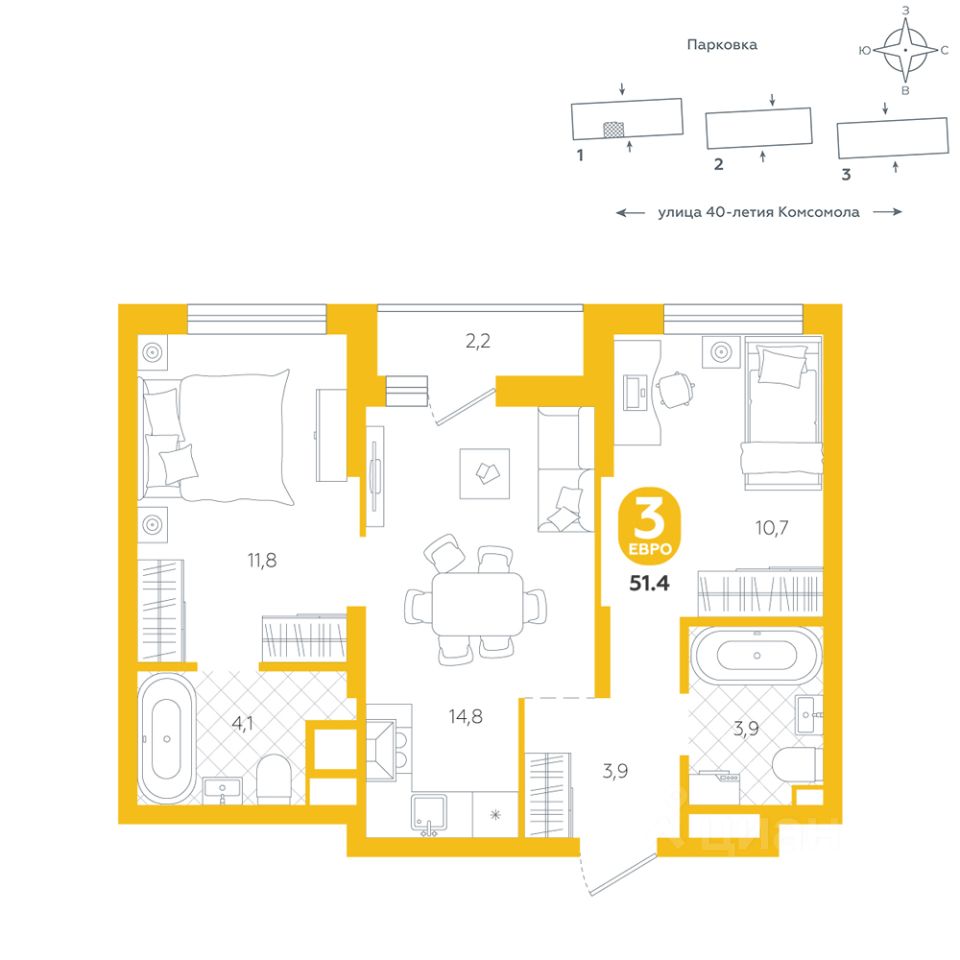 Квартира располагается в ЖК "Комсомольский" — жилом комплексе комфорт-класса. Здесь вы будете наслаждаться беззаботной жизнью, ведь ваш дом — воплощение практичности, безопасности и надежности. Для удобства предусмотрены колясочные на первых этажах домов, где можно оставить велосипеды и коляски в тепле. За безопасность отвечают система электронных ключей и видеонаблюдение. Еще здесь собственная котельная, поэтому в доме всегда будут горячая вода и оплата счетов только за фактически потребленное тепло.
