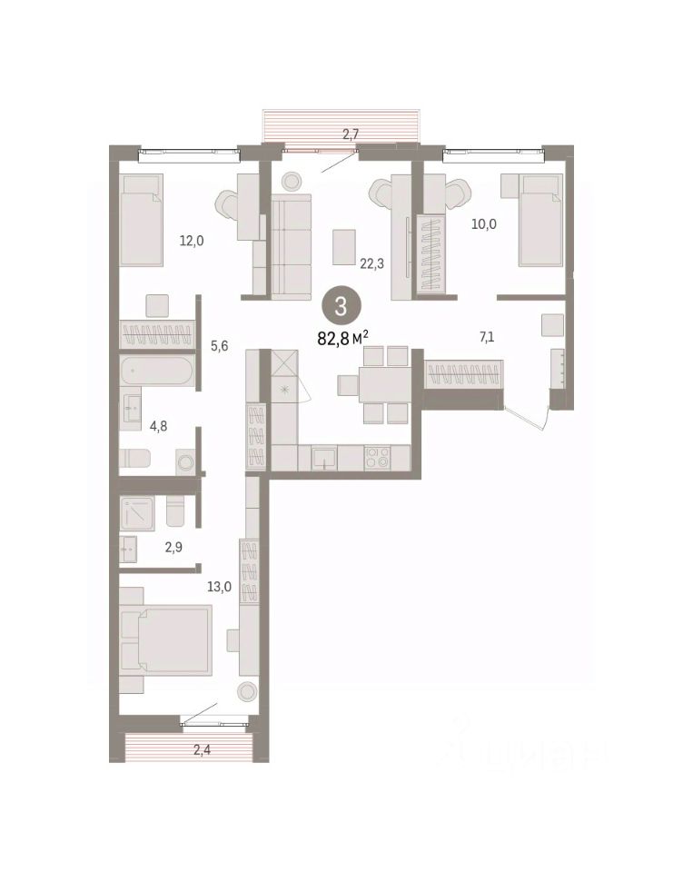 Квартира с кухней-гостиной и тремя спальнями в квартале "Траектория". Особенности планировки: окна на две стороны, стартовая цена, вид во двор, лоджия, разнесённые спальни, предчистовая отделка, мастер-спальня, балкон.