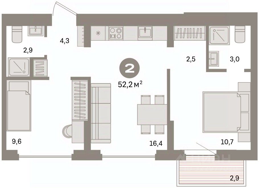 Квартира с кухней-гостиной и двумя спальнями в квартале "Депо". Особенности планировки: гардеробная, вид во двор, разнесённые спальни, предчистовая отделка, мастер-спальня, балкон.