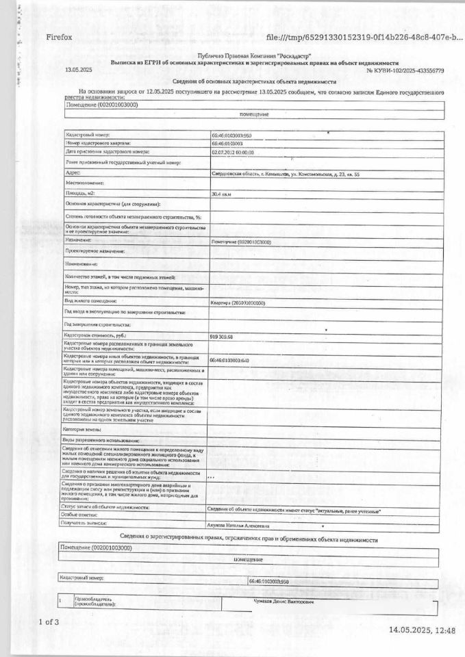 Должник: Чумаков Д.В., Собственник: Чумаков Д.В. Лот: Жилое помещение (квартира), площадь 30,4 кв.м., кадастровый номер: 66:46:0103003:950, г. Камышлов, ул. Комсомольская, д. 23, кв. 55, (зарегистрированные лица - 2 взрослых, 2 несовершеннолетних), н/ц: 814640 р, з-к: 814 р, код: 0014, рег. 30-1798/25