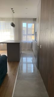 - Встроенная кухня с техникой (духовка, варочная панель, вытяжка, холодильник, посудомоечная машина, свч)