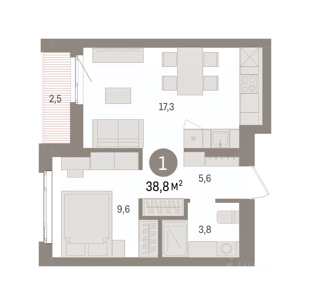 Квартира с кухней-гостиной и одной спальней в квартале "Траектория". Особенности планировки: стартовая цена, лоджия, предчистовая отделка.