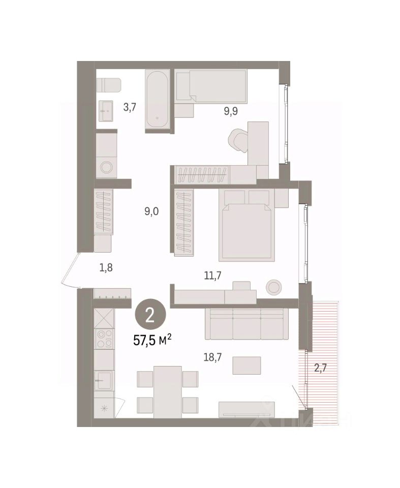 Просторная 2-комн. квартира с предчистовой отделкой в ЖК "Квартал Траектория" на 2 этаже. Общая площадь: 57.5 кв.м., жилая: 21.6 кв.м., площадь просторной кухни-столовой: 18.7 кв.м. Комнаты изолированные, все окна выходят на одну сторону. В квартире один балкон, один совмещенный санузел. Высота потолков 2.82 м.