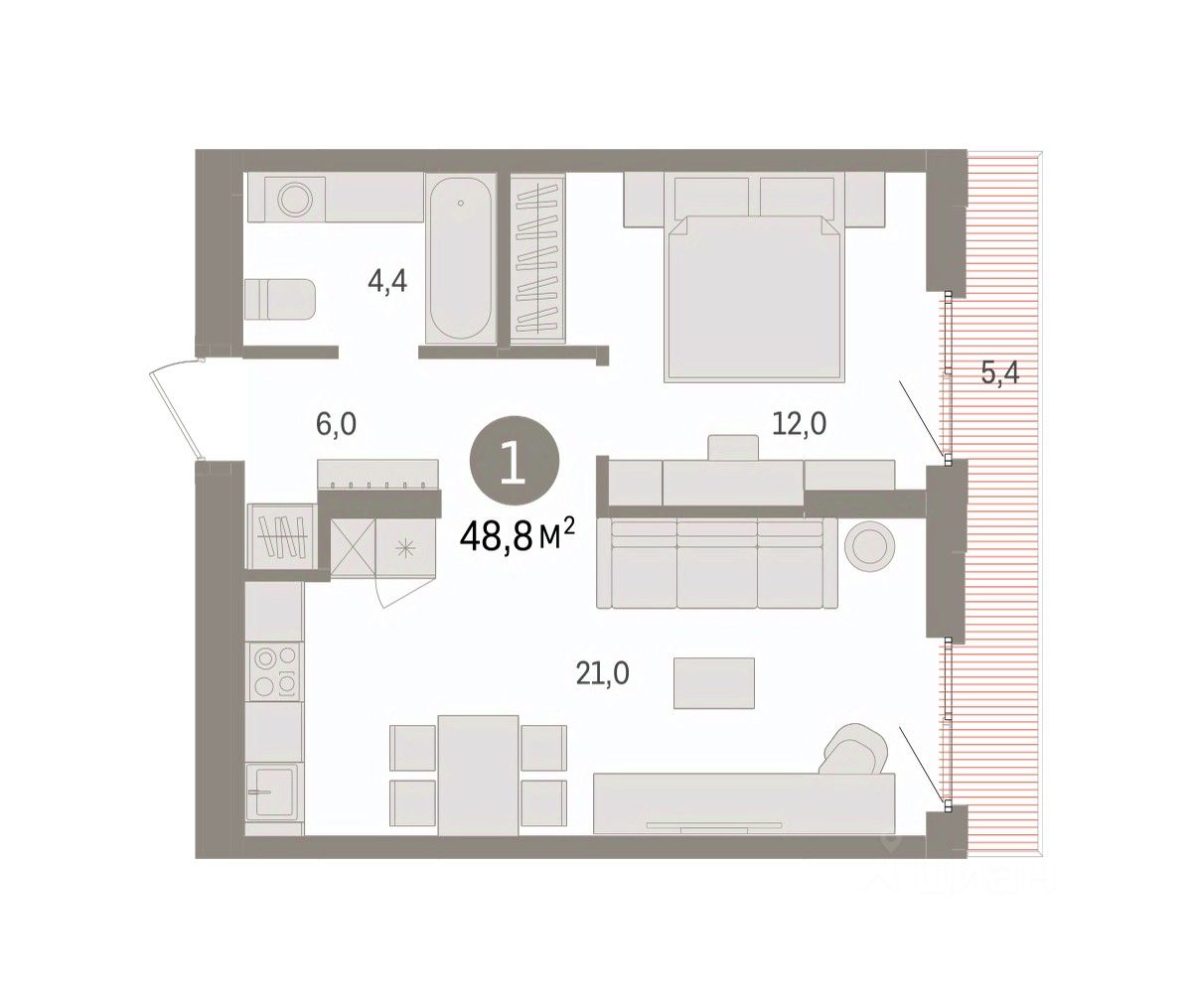 Продается однокомнатная квартира с предчистовой отделкой в ЖК "Квартал Траектория" на 4 этаже. Общая площадь: 48.8 кв.м. Высота потолков 2.82 м.