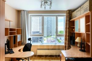 Прекрасная просторная квартира в формате Евро2 общей площадью 46,3м2 (плюс балкон): кухня-гостиная 18,2м2 и спальня 16,3м2. Из гостиной выход на балкон с красивым видом во двор, фонтан тоже, кстати, видно.