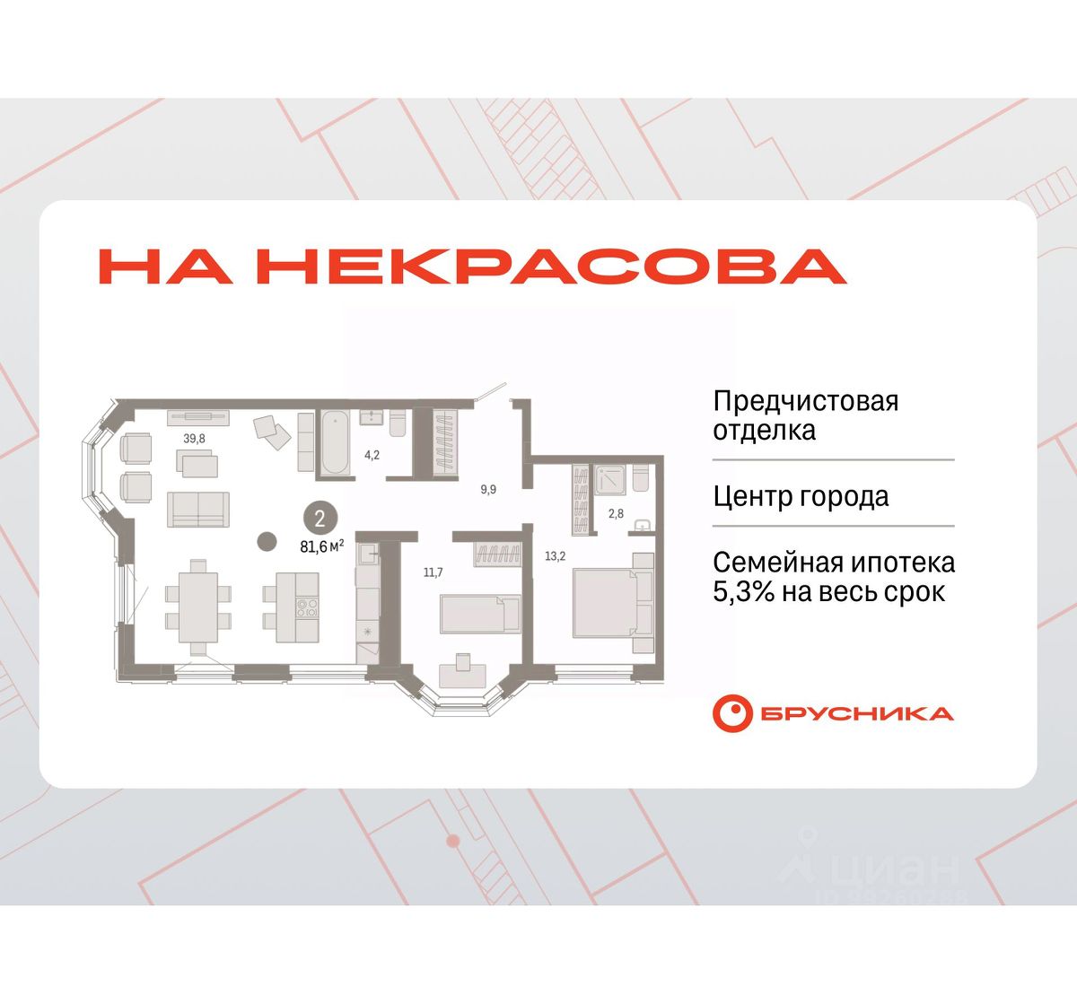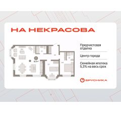 Квартира с кухней-гостиной и двумя спальнями в квартале "На Некрасова". Особенности планировки: предчистовая отделка, мастер-спальня.
