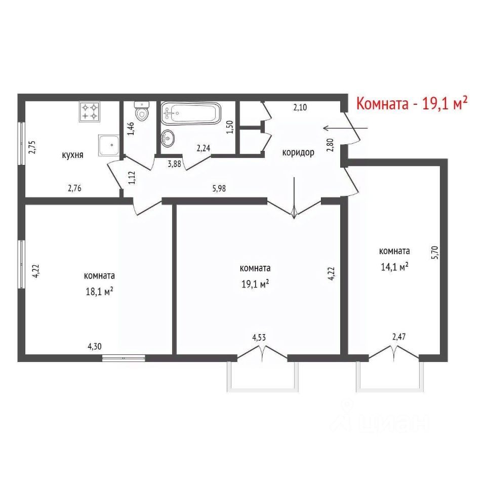Продается просторная комната площадью 19,4 кв. м в современной трехкомнатной квартире.