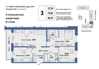 Продаётся 3-комнатная квартира в сданном доме (40-летия Октября, 33 (Дом 4 секция А)), срок сдачи: II-кв. 2025, общей площадью 80.59 кв.м., на 8 этаже. Жилой комплекс "Мир Труд Май" - современные дома под лозунгом традиций. Уютный квартал в самом сердце Уралмаша - в квадрате улиц 40 лет Октября - Кировградская - Ломоносова - Калинина. Выполняется застройка разной этажности, которая состоит из четырех многоквартирных домов с частными дворами, подземным паркингом с кладовыми.
