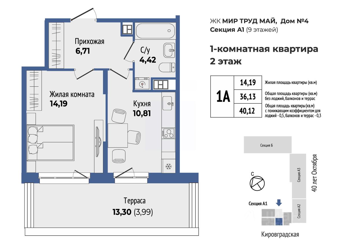 Продаётся 1-комнатная квартира в сданном доме (40-летия Октября, 33 (Дом 4 секция А)), срок сдачи: II-кв. 2025, общей площадью 40.12 кв.м., на 2 этаже. Жилой комплекс "Мир Труд Май" - современные дома под лозунгом традиций. Уютный квартал в самом сердце Уралмаша - в квадрате улиц 40 лет Октября - Кировградская - Ломоносова - Калинина. Выполняется застройка разной этажности, которая состоит из четырех многоквартирных домов с частными дворами, подземным паркингом с кладовыми.