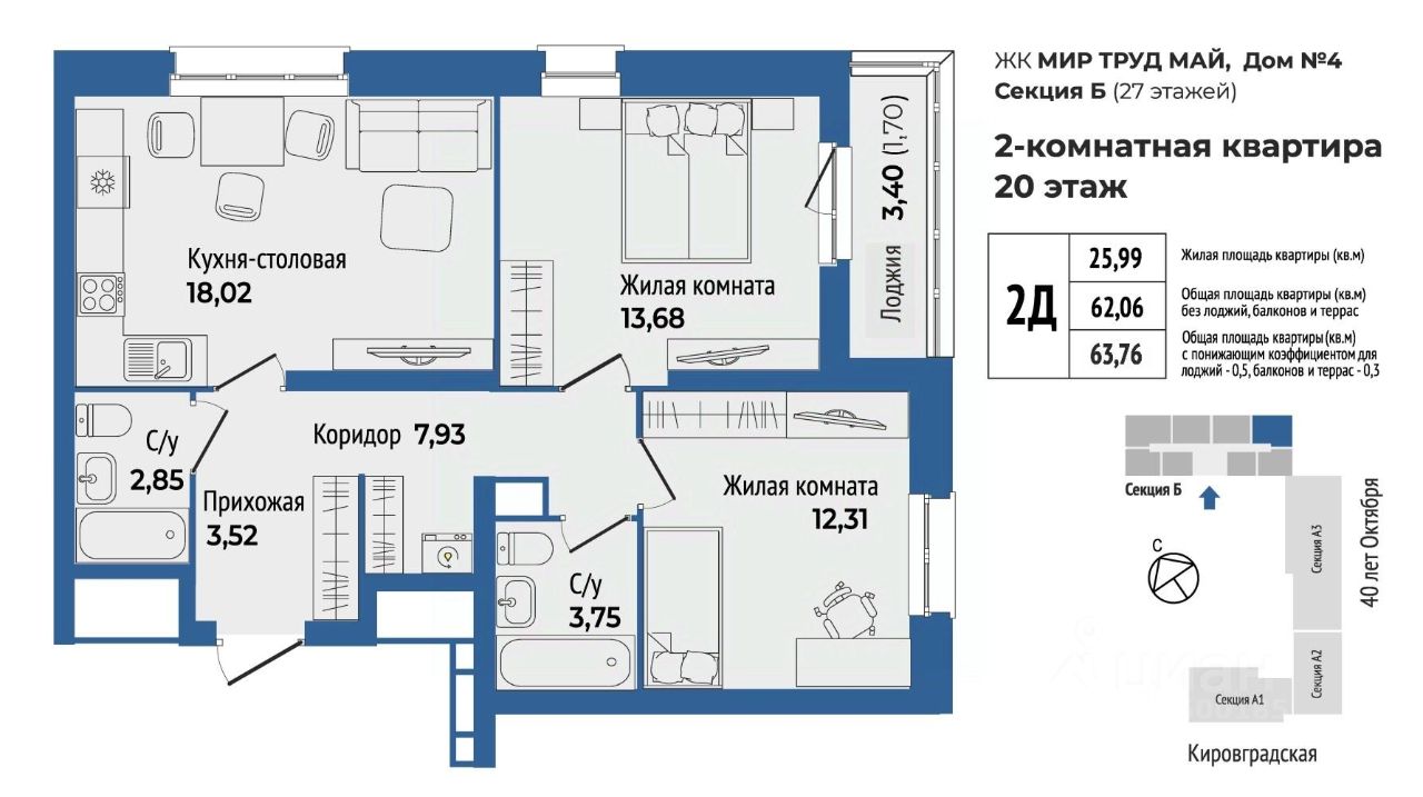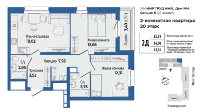Продаётся 2-комнатная квартира в строящемся доме (Дом 4 секция Б), срок сдачи: I-кв. 2026, общей площадью 63.76 кв.м., на 20 этаже. Жилой комплекс "Мир Труд Май" - современные дома под лозунгом традиций. Уютный квартал в самом сердце Уралмаша - в квадрате улиц 40 лет Октября - Кировградская - Ломоносова - Калинина. Выполняется застройка разной этажности, которая состоит из четырех многоквартирных домов с частными дворами, подземным паркингом с кладовыми.