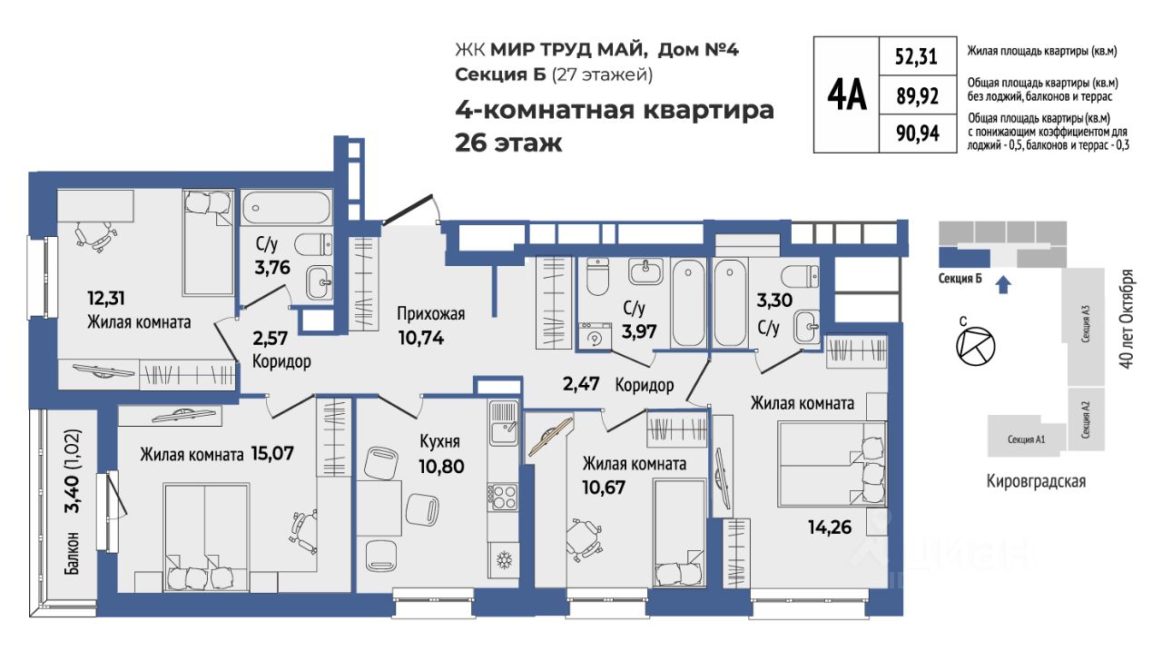 Продаётся 4-комнатная квартира в строящемся доме (Дом 4 секция Б), срок сдачи: I-кв. 2026, общей площадью 91.62 кв.м., на 26 этаже. Жилой комплекс "Мир Труд Май" - современные дома под лозунгом традиций. Уютный квартал в самом сердце Уралмаша - в квадрате улиц 40 лет Октября - Кировградская - Ломоносова - Калинина. Выполняется застройка разной этажности, которая состоит из четырех многоквартирных домов с частными дворами, подземным паркингом с кладовыми.