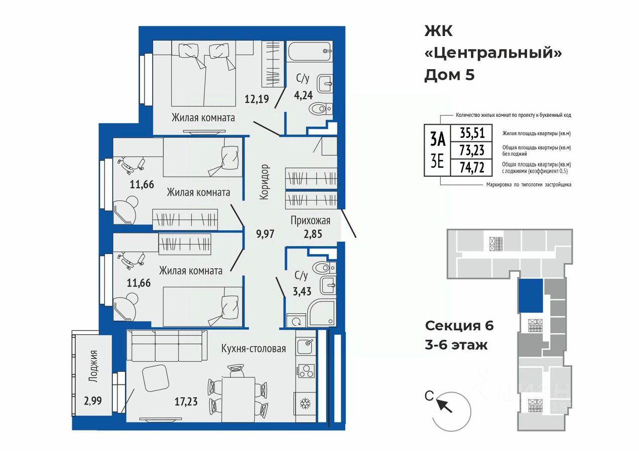 Продаётся 3-комнатная квартира в строящемся доме (Дом 5), срок сдачи: II-кв. 2027, общей площадью 74.79 кв.м., на 5 этаже. Микрорайон "Центральный" - проект комплексной застройки в самом центре Верхней Пышмы на Успенском проспекте в границах улиц Калинина — Кривоусова — Орджоникидзе. Пять многоквартирных домов переменной этажности с обособленными дворами, детскими и спортивными площадками.