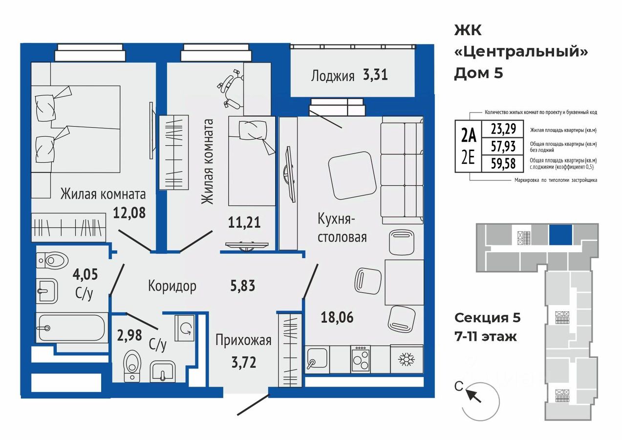 Продаётся 2-комнатная квартира в строящемся доме (Дом 5), срок сдачи: II-кв. 2027, общей площадью 59.66 кв.м., на 10 этаже. Микрорайон "Центральный" - проект комплексной застройки в самом центре Верхней Пышмы на Успенском проспекте в границах улиц Калинина — Кривоусова — Орджоникидзе. Пять многоквартирных домов переменной этажности с обособленными дворами, детскими и спортивными площадками.