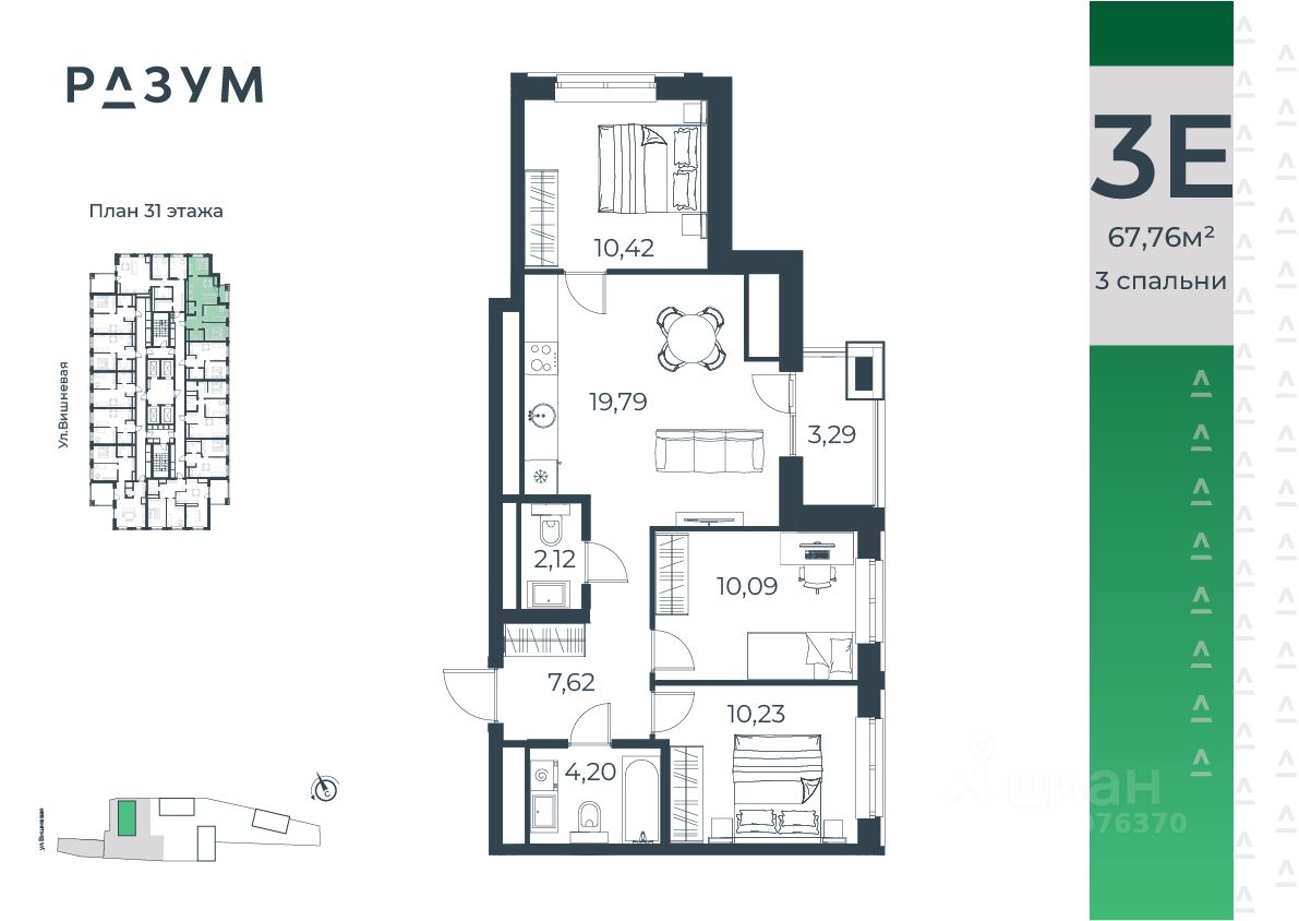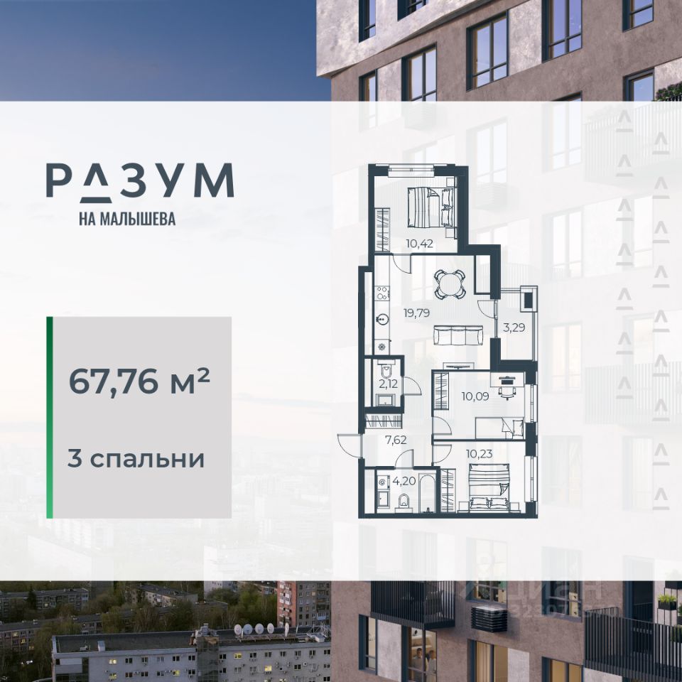 "РАЗУМ на Малышева" — новый проект от федерального девелопера с 12-летним опытом. Квартал расположен в самом сердце Екатеринбурга в Кировском районе. В шаговой доступности: 8 детских садов; 7 школ; прогулочные зоны и парки; магазины; учреждения профессионального образования. "РАЗУМ на Малышева" — это четыре 31-этажных башен на улице Малышева. Дополнительная приватность, безопасность и тишина создаётся за счёт возвышения домов на стилобате. Балконы на фасадах открывают виды на город и во двор, а угловые террасы открывают ещё больше простора и потрясающих видов. Жители квартала "РАЗУМ на Малышева" наслаждаются зелёными зонами круглый год. 60% территории занимает озеленение с деревьями, кустарниками и многолетниками. Здесь прогулки, отдых, работа и встречи с друзьями проходят в уютных зонах с перголами, шезлонгами и гамаками. "РАЗУМ на Малышева" — это: развитая инфраструктура; эргономичные и яркие архитектурные решения; дополнительный уровень спокойствия за счет возвышения на стилобате; во дворе высажены деревья и кустарники с учетом 4 сезонов; многоуровневое освещение; благоустройство; высокий уровень безопасности; стильные гранд-лобби и ресепшн; особые панорамные виды; собственная управляющая компания; собственный детский сад на 150 мест; четырёхэтажный паркинг; соседский центр место развития добрососедства; коммерческие помещения. Эргономичность и удобство в каждом квадратном метре — основа планировочных решений в квартале "РАЗУМ на Малышева". Для каждого сценария жизни найдется планировка: представлены десятки вариантов от 29,92 м² до 84,88 м². Квартиры с террасами размещены на верхних этажах домов. Терраса — это дополнительное пространство для слияния с природой.