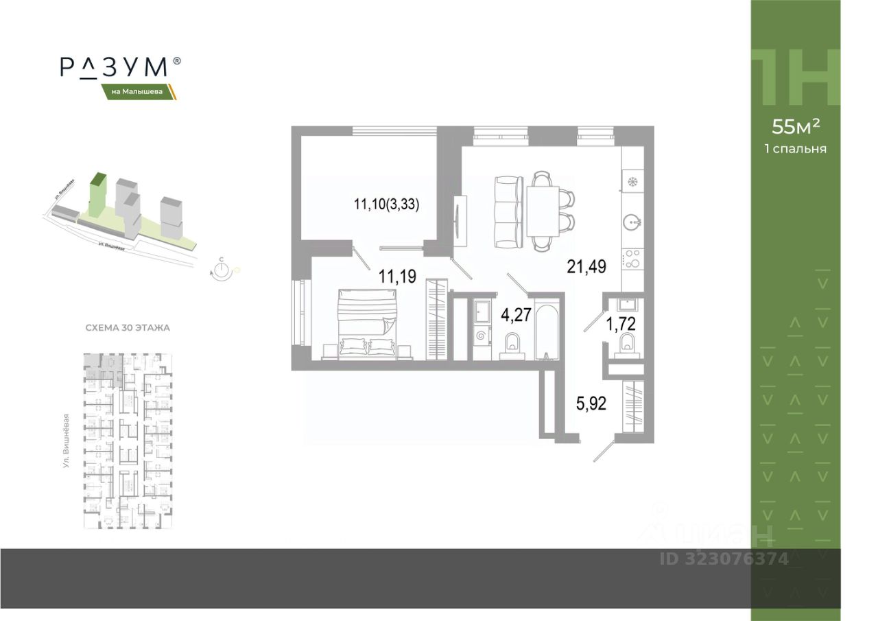 "РАЗУМ на Малышева" — новый проект от федерального девелопера с 12-летним опытом. Квартал расположен в самом сердце Екатеринбурга в Кировском районе. В шаговой доступности: 8 детских садов; 7 школ; прогулочные зоны и парки; магазины; учреждения профессионального образования. "РАЗУМ на Малышева" — это четыре 31-этажных башен на улице Малышева. Дополнительная приватность, безопасность и тишина создаётся за счёт возвышения домов на стилобате. Балконы на фасадах открывают виды на город и во двор, а угловые террасы открывают ещё больше простора и потрясающих видов. Жители квартала "РАЗУМ на Малышева" наслаждаются зелёными зонами круглый год. 60% территории занимает озеленение с деревьями, кустарниками и многолетниками. Здесь прогулки, отдых, работа и встречи с друзьями проходят в уютных зонах с перголами, шезлонгами и гамаками. "РАЗУМ на Малышева" — это: развитая инфраструктура; эргономичные и яркие архитектурные решения; дополнительный уровень спокойствия за счет возвышения на стилобате; во дворе высажены деревья и кустарники с учетом 4 сезонов; многоуровневое освещение; благоустройство; высокий уровень безопасности; стильные гранд-лобби и ресепшн; особые панорамные виды; собственная управляющая компания; собственный детский сад на 150 мест; четырёхэтажный паркинг; соседский центр место развития добрососедства; коммерческие помещения. Эргономичность и удобство в каждом квадратном метре — основа планировочных решений в квартале "РАЗУМ на Малышева". Для каждого сценария жизни найдется планировка: представлены десятки вариантов от 29,92 м² до 84,88 м². Квартиры с террасами размещены на верхних этажах домов. Терраса — это дополнительное пространство для слияния с природой.