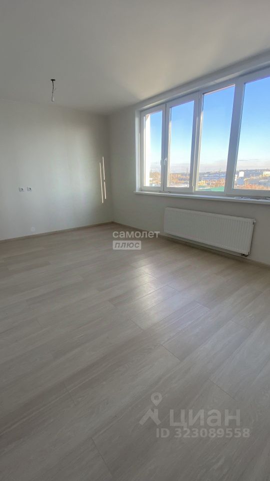 В комнате установлены большие окна с белыми рамами, которые обеспечивают хорошее естественное освещение. Квартира в чистовой отделке и готова к обустройству. Отсутствие мебели и декора позволяет представить различные варианты дизайна и использования пространства.