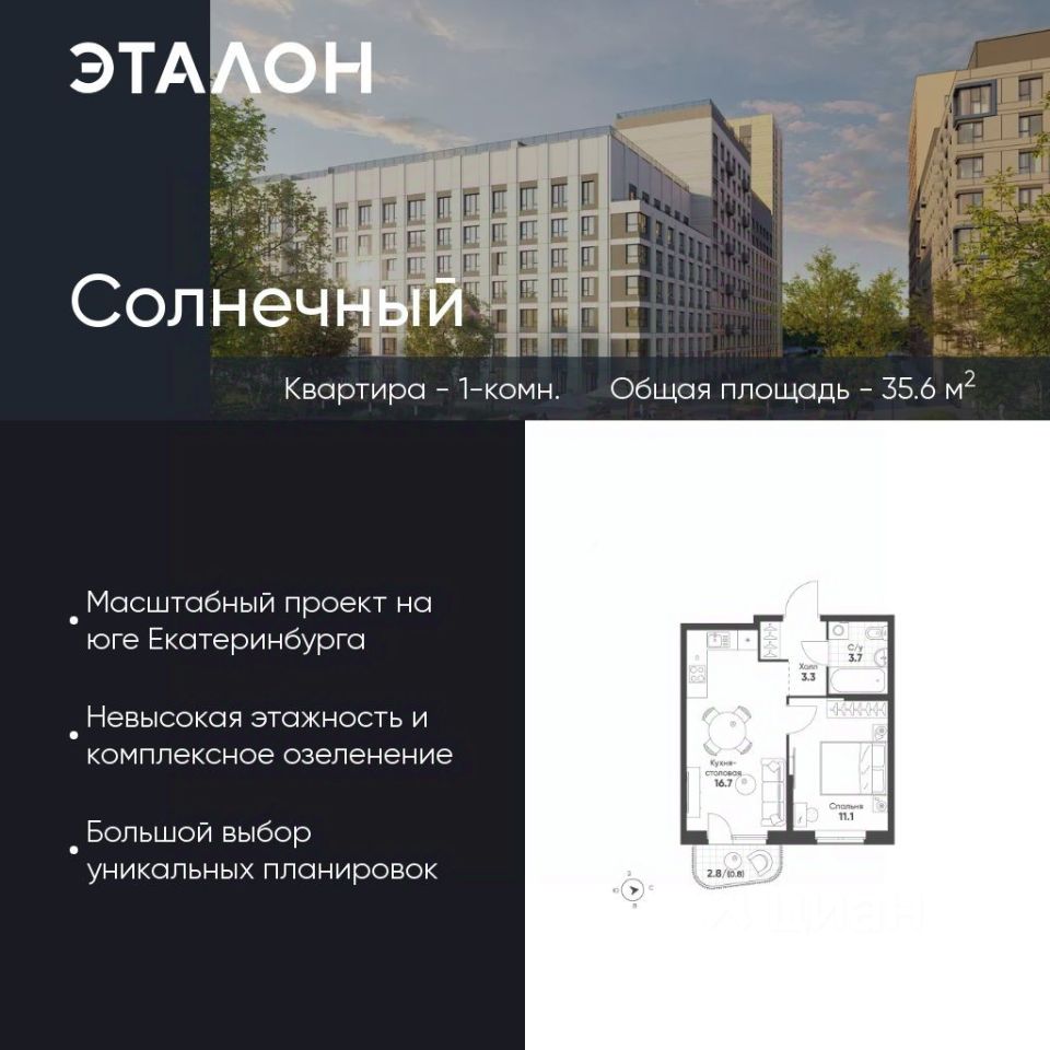 Продается квартира 728, по адресу Свердловская область, г. Екатеринбург, ул. Чемпионов, корпус Солнечный, блок 11.1 в Солнечный на 12 этаже, с площадью 35.6 м2.
