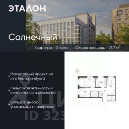 Продается квартира 80, по адресу ЖК "Солнечный", корпус Солнечный, блок 7.3-7.4, корпус 1 в Солнечный на 9 этаже, с площадью 75.7 м2.