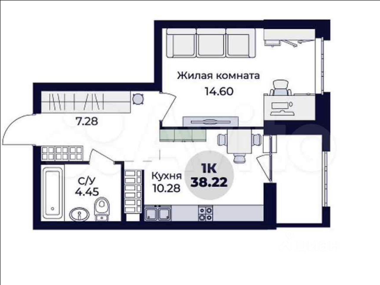Общая площадь - 38,22 кв. м: эргономичная кухня 10,28 кв. м. с выходом на застекленную лоджию, просторная спальня 14,6 кв. м, совмещенный санузел 4,453 кв. м, коридор и прихожая площадью 7,28 кв. м. Высота потолков - 2,75 метра!