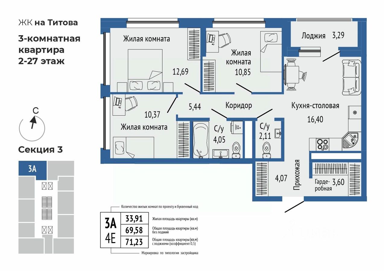 Продаётся 3-комнатная квартира в строящемся доме (Секции 4,5,7), срок сдачи: I-кв. 2027, общей площадью 72.93 кв.м., на 14 этаже. Новый жилой комплекс "Квартал на Титова" от застройщика "Правобережный" расположен по адресу: г. Екатеринбург, улица Титова.