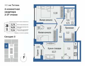 Продаётся 3-комнатная квартира в строящемся доме (Секции 4,5,7), срок сдачи: I-кв. 2027, общей площадью 55.54 кв.м., на 15 этаже. Новый жилой комплекс "Квартал на Титова" от застройщика "Правобережный" расположен по адресу: г. Екатеринбург, улица Титова.