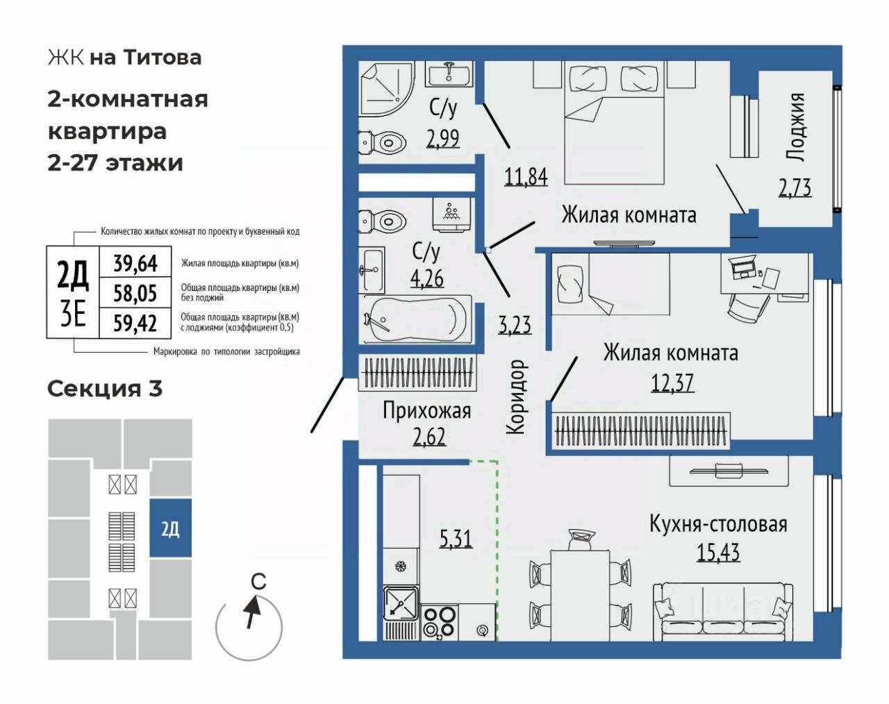 Продаётся 3-комнатная квартира в строящемся доме (Секции 4,5,7), срок сдачи: I-кв. 2027, общей площадью 59.74 кв.м., на 27 этаже. Новый жилой комплекс "Квартал на Титова" от застройщика "Правобережный" расположен по адресу: г. Екатеринбург, улица Титова.