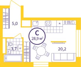 Однокомнатная квартира-студия от застройщика в ЖК "Астон.Сезоны" на 18 этаже. Квартира без отделки, новый собственник может сделать ремонт по своему дизайн-проекту. Общая площадь: 28.9 кв.м., площадь гостиной 20 кв.м., из которых 5 кв.м. выделено под кухонную зону. Угловая квартира, очень светлая, естественная вентиляция при открытии окон. В квартире один совмещенный санузел. Высота потолков 2.7 м.